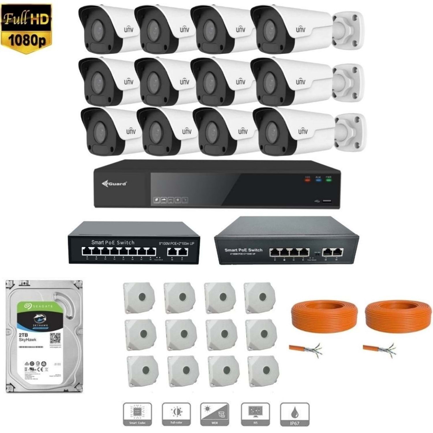 Kurulum için gerekli olan İp Kamera, Nvr Kayıt Cihazı,2 TB Harddisk, Poe switch, Cat6 Kablo, Buat, ile birlikte gönderilecektir.